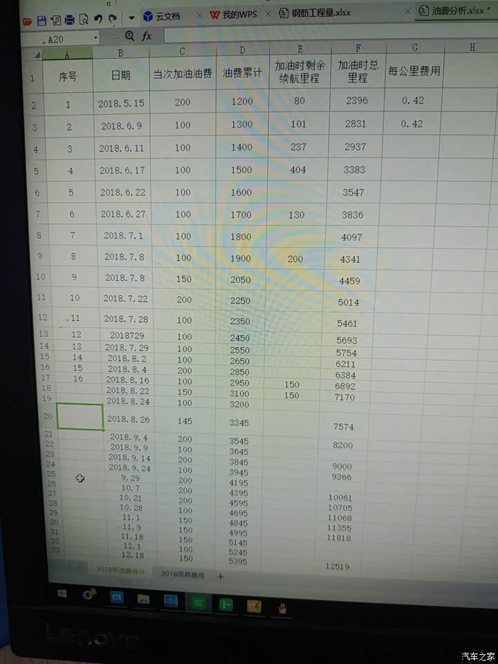 说实话没算过百公里几个油,也没有用测油耗的软件,都是自己做了个电子表格,每次加油的钱数和相应的总里程记一下。最开始没想着记,后来改变想法了想算算自己一年开车的花多少钱后才开始记,现在分享一下,加油的时候没到一万三,回了趟老家,现在一万三千多点