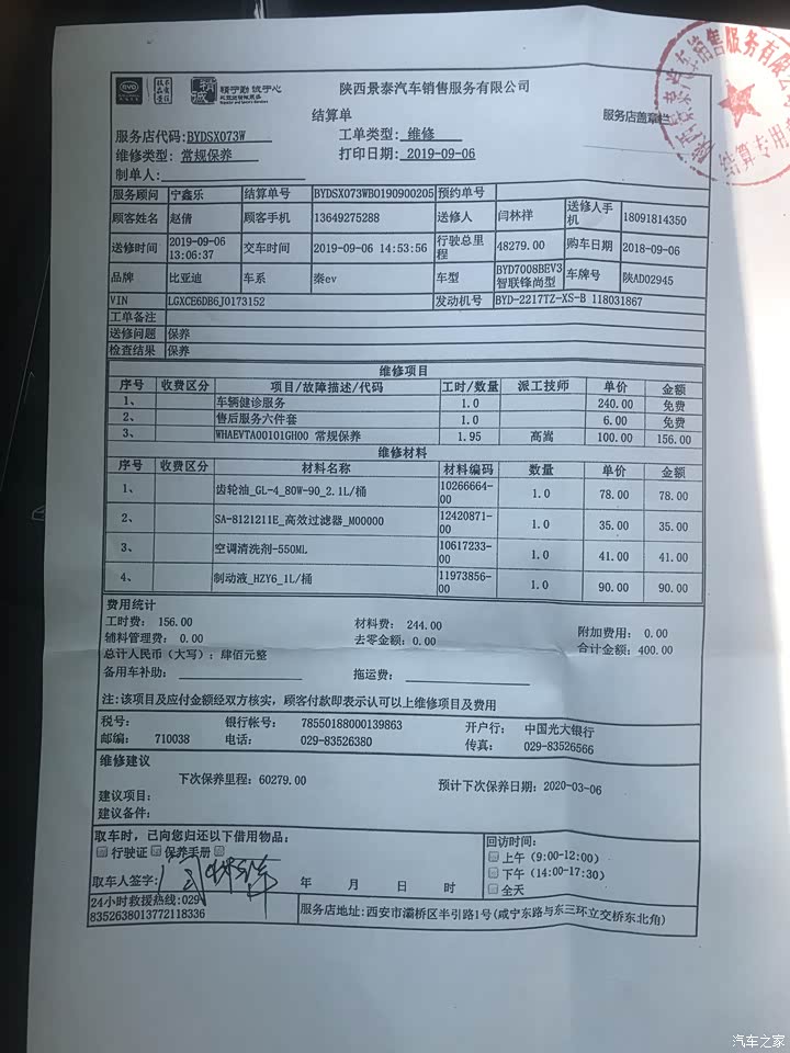 40000公里,更换了齿轮油和刹车油,因为空调的问题,我还专门清洗了一下空调系统。一起算下来一共花了400块。总体上看。目前保养4次,3次收费,这次是第一次因为更换东西收费,以前都是检查费。由此可见,以后的春电车车主4万公里前不用专门保养,只要自己开着没问题就不用来4S店,都是检查啊。