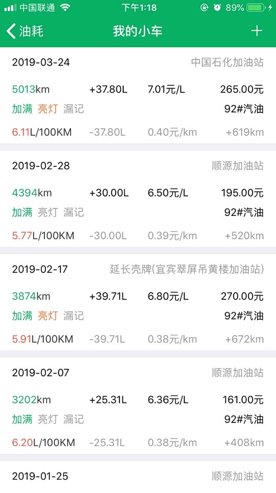 提车的时候4S送了半箱油,跑完一格的时候大约150公里左右,后来自己加了两次三大格(也就是加满)第一次加满,跑到剩一大格的时候跑了666km,第二次加满跑到剩一大格的时候里程数是1482km,我这里油价6.9元/升,也就差不多4毛钱左右一公里吧。