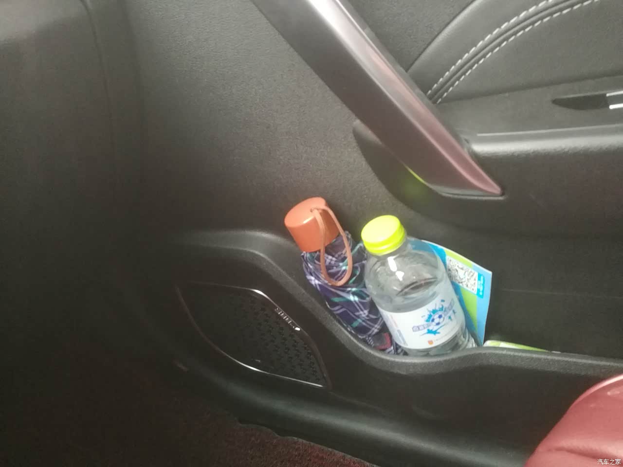 前排门板的储物空间比较大,放两瓶水都没问题,一般都是放把雨伞备用