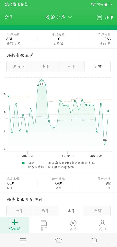 目前总共行驶了10750km,累计加油912升,目前车辆剩余估计26升,平均百公里油耗8.31升,平均油费0.56元/公里
