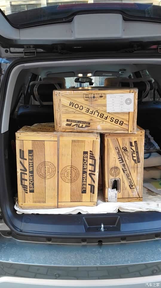 四个车轮箱子放在后备箱的照片,每次换胎的时候,四个轮子一字排开。。。正好!