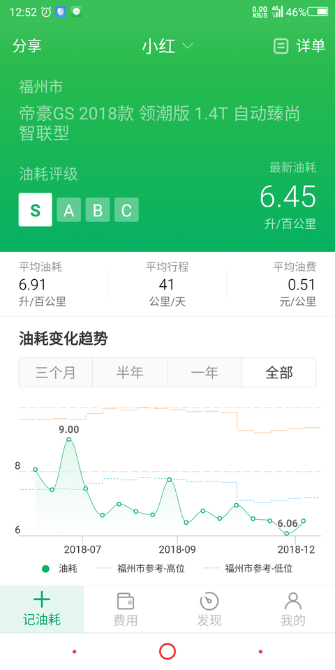 一共跑了9000多公里了。首保前百公里在7到7.5个油毕竟是新车还是新手驾驶习惯还没养成,接近4000公里首保后油耗降到了6.5个油左右驾驶习惯也养成了。最低跑过百公里6升油。低速时保持匀速行驶转速控制在1300转到1500转相当省油,上高速后转速保持在2000到2200也时很省油的(上下班都要走高速自己得到的结论希望可以帮到车友们)。加满60升油能跑900公里左右,续航能力表现不错。