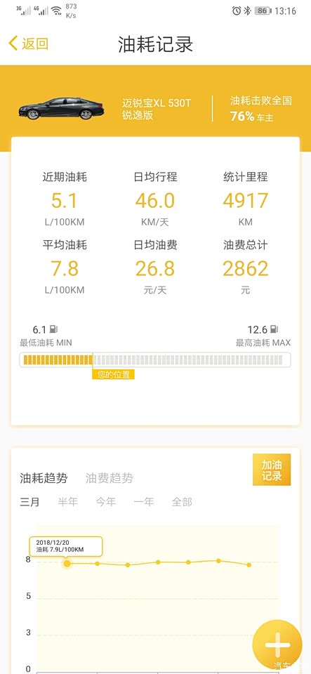 分别用小熊油耗和mychevy记录油耗,不过不知道谁更准,取两个平均值了!