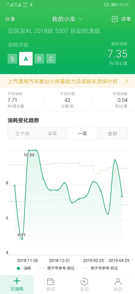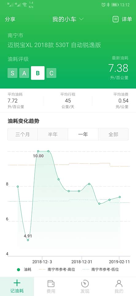 开了快8000公里了,目前,油耗已经稳定,南宁市区,平均油耗7.6,天气热,开空调就到8.0左右。