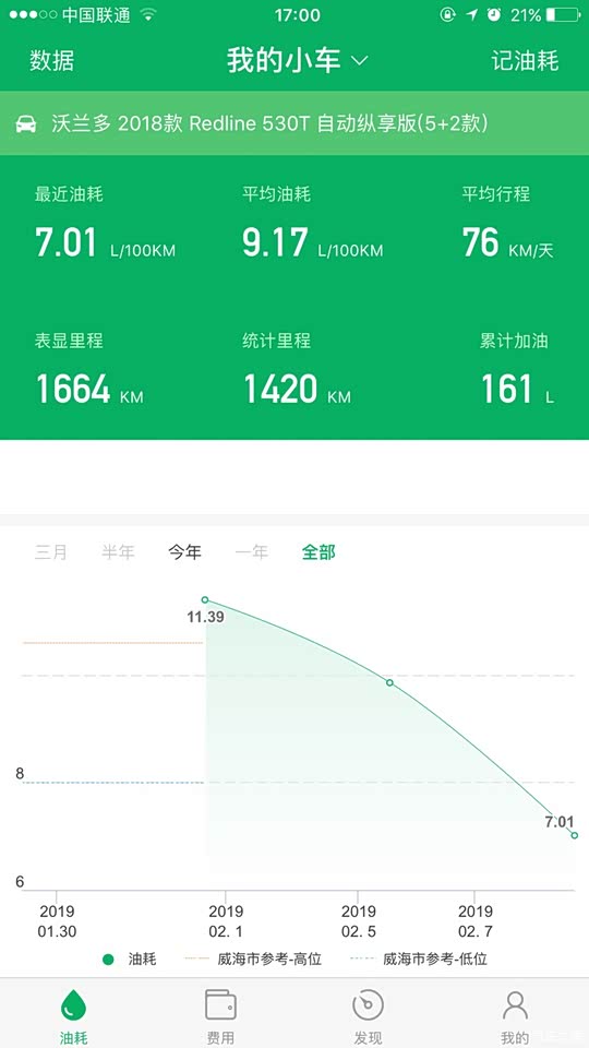 1800公里了,市区比较堵的情况9个油,不堵的市区7个出头。高速100公里5.5,满载跑120公里7个。过年回老家跑了800公里花了340块钱的油。轿车水平。