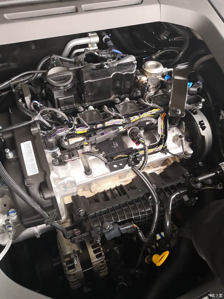 发动机舱概览,整体有塑料盖板遮挡,盖板上有隔音降噪棉,所以看起来没那么凌乱,噪音控制也还可以