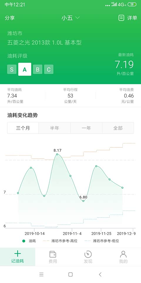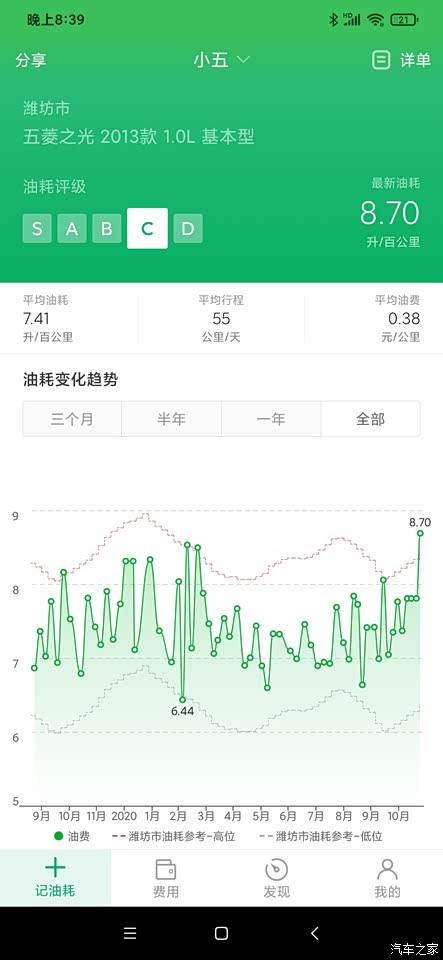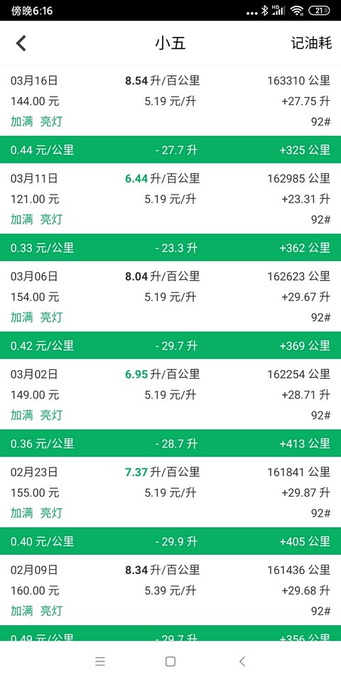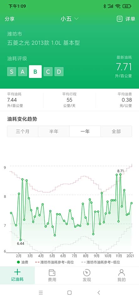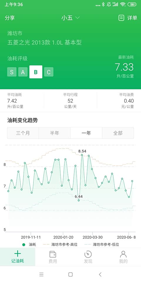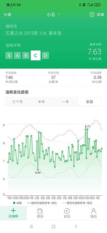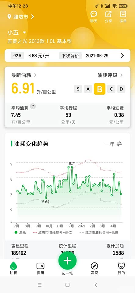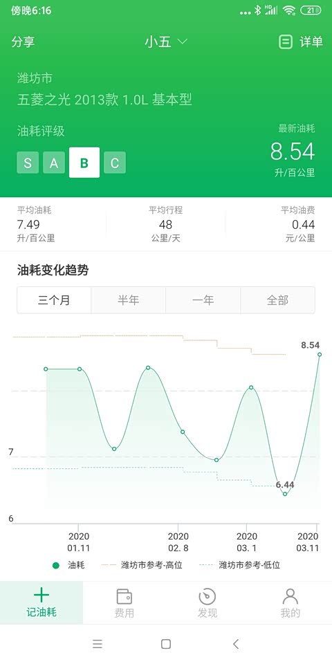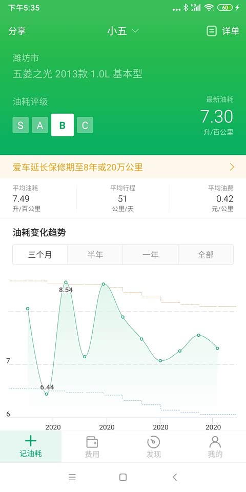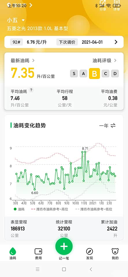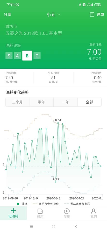 最近的油耗表现不是很好,应该是很多短距离行驶,造成的油耗增加!加上行驶的时间很短,没有在短时间消耗油量,因为有了代步车辆,五菱的行驶的时间就缩短了很多,没有太多的行驶时间和里程,走走停停,经常打火也增加了油耗!这也是为什么最近油耗表现一直不是很好的原因!
