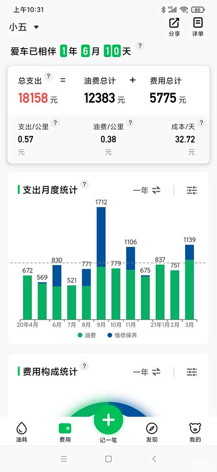 车辆的费用也是一个家庭非常大的开支,每公里的费用基本在0.57,平均每天30多块钱!