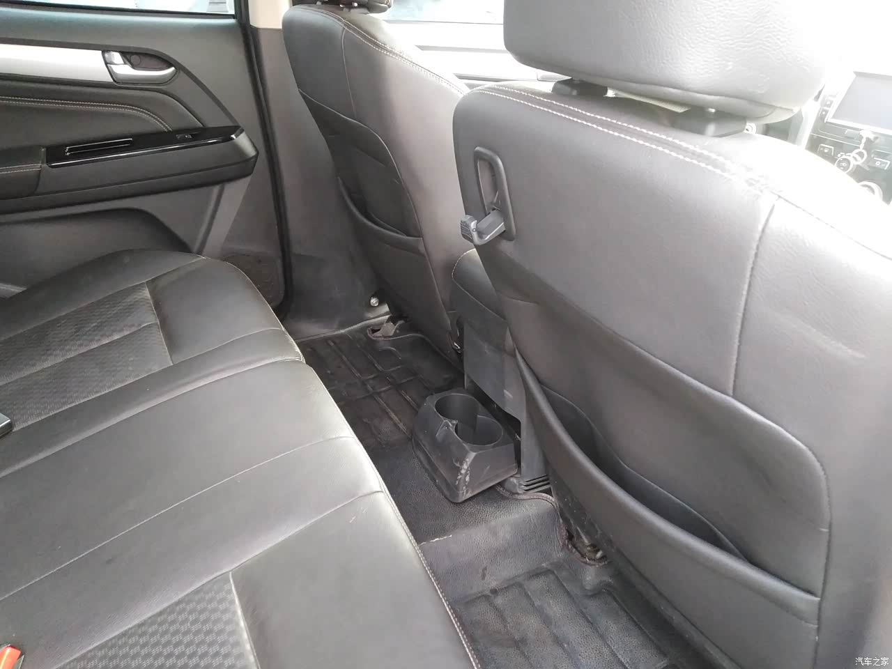 外观是我比较喜欢的,其中一点就是尺寸大,而且设计的各个方面都和高一个级别的D-MAX看齐。前脸是最有特色的,正面看上去车头很高,前中网特别吸睛,车标也是品牌logo很高大上,唯一不足卤素大灯,提车当天我就自己换了LED大灯,看上去上了一个档次。个人感觉有点像老款霸道。转向灯设计在后视镜部分,这对于这个尺寸的车型来说的确安全了不少。后尾灯设计相对来说比较简洁,感觉小了点,不如前灯设计的经典,上下车有踏板,倒车雷达,倒车影像用起来很方便。这车没有高位刹车灯,问了销售原来有龙门架的都装不了高位刹车灯,而且这车也高,其实某种意义上也无所谓。货箱有玻璃钢封包设计,固定货物边架部位可以拉绳子很方便。备胎下悬挂,也是铝合金轮毂还不错。