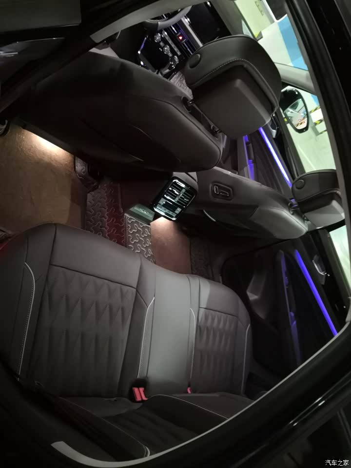家里黑色,米色内饰的车都开过了,就专门要了棕色内饰,这个颜色好打理上档次。车内所有灯光都是led,除了后备箱是黄灯,而且环境氛围灯10色可调,脚底都有白色照明灯,小的储物盒里也有灯,门把手有灯,迎宾踏板有灯,地面照明有灯,能有灯的地方都放上灯了。二排有遮阳帘。中央储物格有空调可类似冰箱使用。前排座椅加热和通风,还有空气净化器。还有一个高级功能是熄火半小时内空调热风还可以出风,这个是冬天短暂离开车内比较人性化的功能。