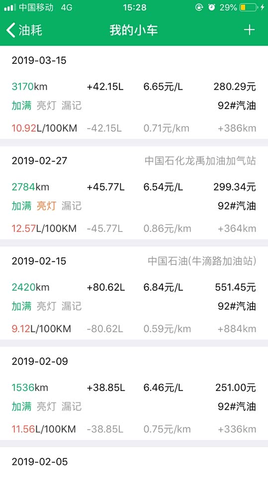 油耗真的蛮高的,我现在不敢用普通模式驾驶了,现在用经济模式了。第1张是我实测的油耗,第2张是它表上显示的油耗。中间有一次油耗记漏了,所以说记的是两次加起来加的油。