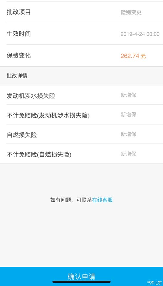 提车时,在4s店上了三者一百万、车损险、盗抢险、不计免赔以及交强险,总共将近7500元。最近在手机app上自助添加了自燃险和发动机涉水险,这两个险种加起来的费用才260多,没多少钱,就加上了,以防万一嘛。