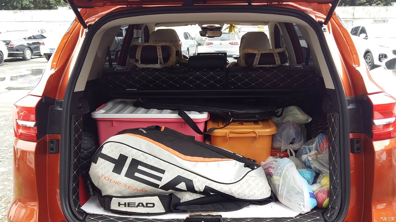 后排空间比原车放的东西多很多,比较宽松。放了两个大箱器械,还有一个八支装网球拍大包。