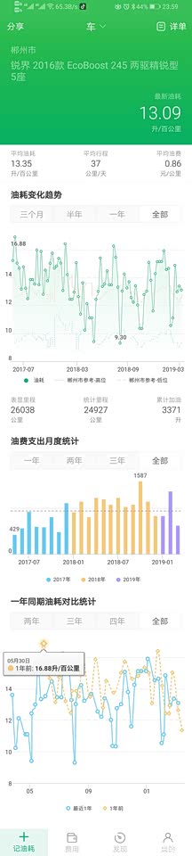 这是我从1111公里开始的所有加油记录,现在百公里油耗还13.35升