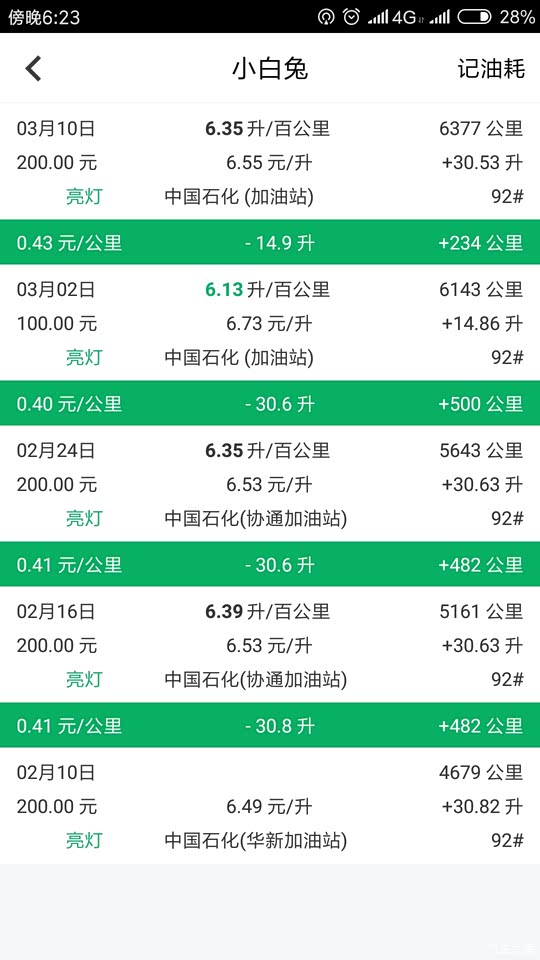 说到油耗,首保内表显7点几。现在快到二保,表显5.9,实测6.4(上下有轻微浮动)。 油耗这玩意儿,除了本身原因,其次路况啊、驾驶习惯、载重都有很大因素。 起步地板油、大脚刹车这样子肯定油耗高一点嘛! 我这记录的是上海郊区的使用情况,如果在国道或者高速 开还要更省。 手动挡5档转速2000,速度80最省。我跑高速都120,其实也不会太省油。