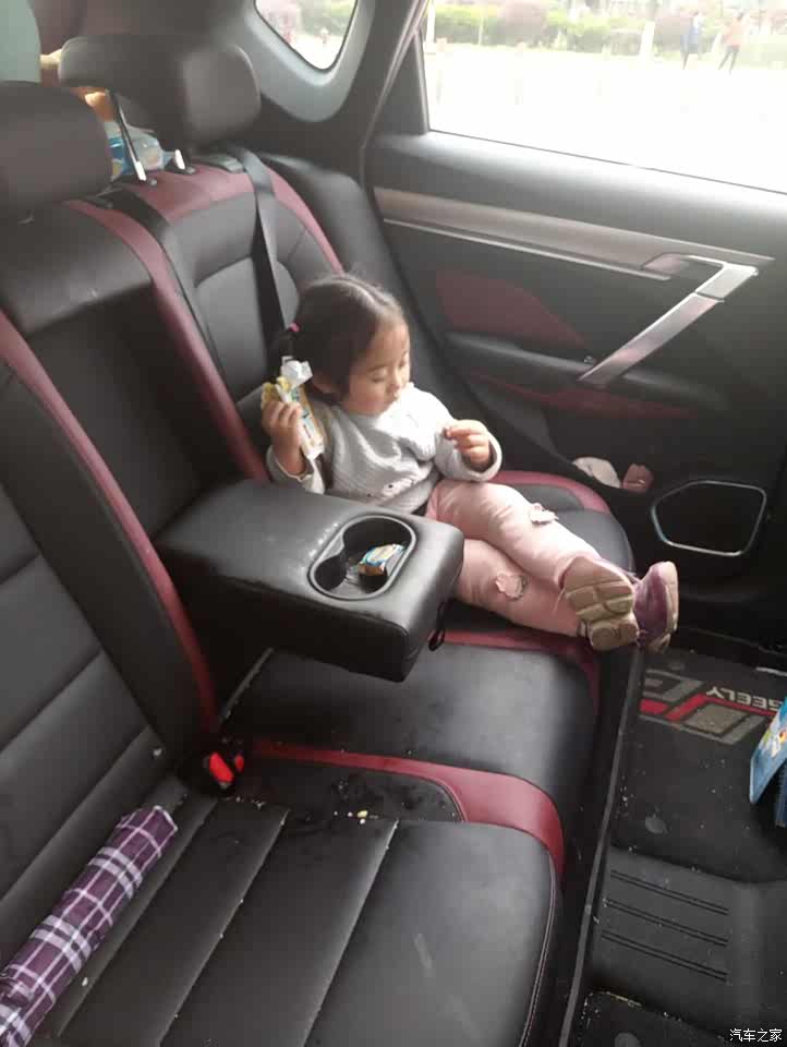后排空间足够,中间的水杯位我们一般是放下来的,方便女儿吃零食