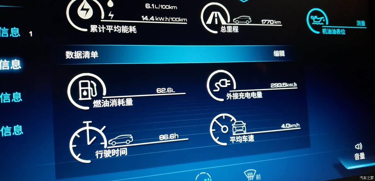 冬天满电开空调,50到70的时速,实际续航大约在60到70公里,这个和环境温度有很大关系。电耗总的来说不敏感。但是油耗真的是需要吐槽一下了,跑个长途,高速油耗基本上在12个左右,2.0T的发动机,12个油,是不是太高了。