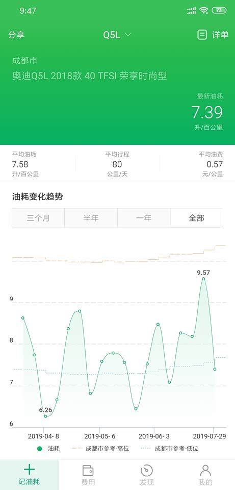 小熊油耗记录,每次亮灯加油得出评价油耗7.6L,和表显油耗接近。高速如定速110巡航,5.8L的油耗很常见。这辆车的耗油真的很加分!