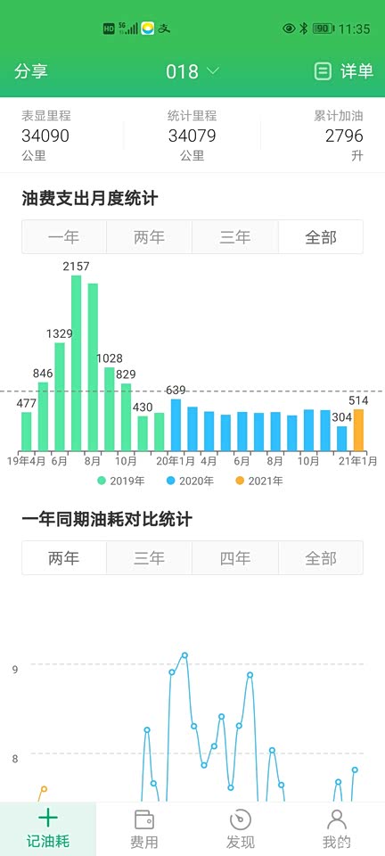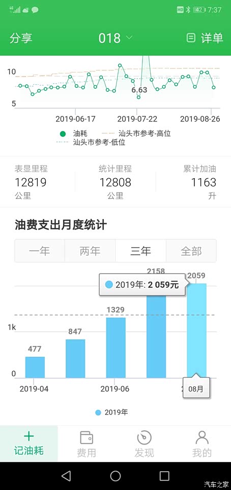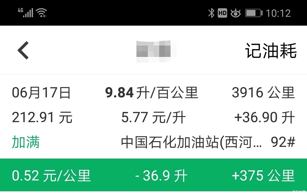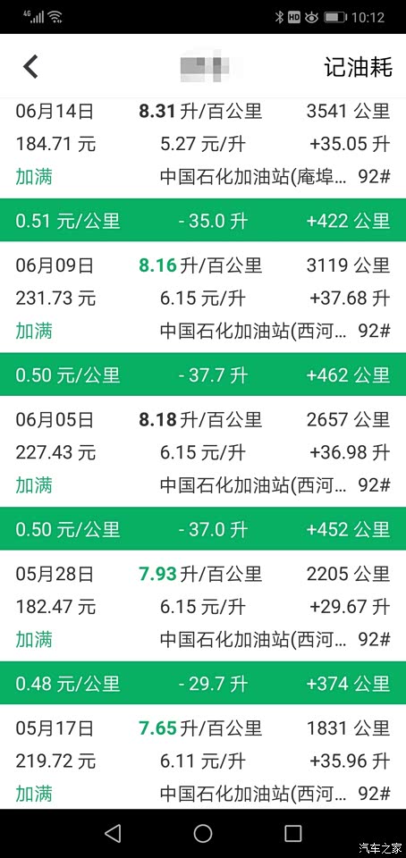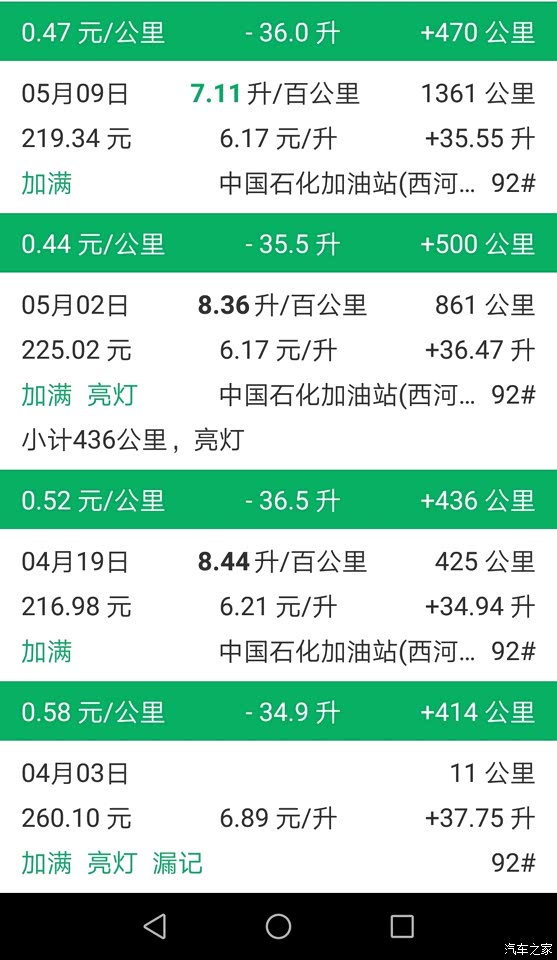 平时基本都是国道和市区,国道60%,市区40%左右。两个月下来总体感觉就是这个车不能大脚油车大脚刹车,否则油耗会很高,特别是在市区,几百米一个红绿灯,速度刚提上来马上就要刹车了。这最近一壶油全部都是在市内跑(前后空调全开),下来将近十个油。 这车油耗方面到目前来讲是相当满意的,这么大的车身,又那么高,风阻得多大,平均才8.17升,而且从提车到现在基本上一上车就开空调,要么前空调,要么前后全开,个人感觉已经相当省了。 下面是我自提车以来每次加油用小熊油耗记录的情况,给大家做个参考