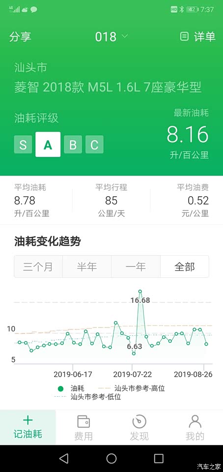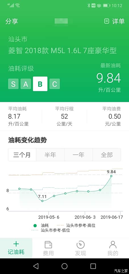 在市里开还是要保持心态,不要急,关键是急也没用,除了油耗会跟随你的热情同步高涨之外,速度方面的表现则比较高冷,相对来说会比较快一点,但绝对没有小车提速的那种直线感。 当然,想开快车的人也不会买这种类型的车,这么高、这么长、自重1.6吨,配个1.6的发动机,能给到这样的油耗,还要啥自行车! 上面上了三张图没法再上了,这里再把小熊首页的平均油耗上给大家看下