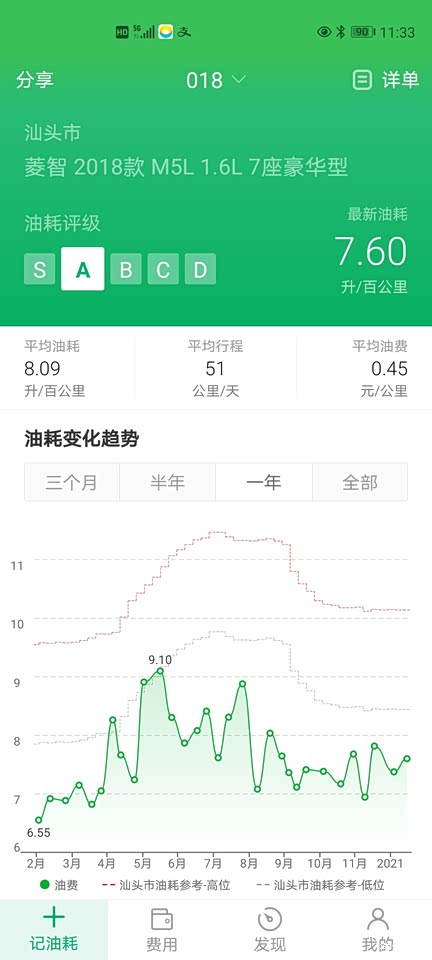现在市内跑的没以前多了,大部分都是省道和高速,市区里程数最多占25%,所以油耗也有所下降。基本保持在七个多油的水平。