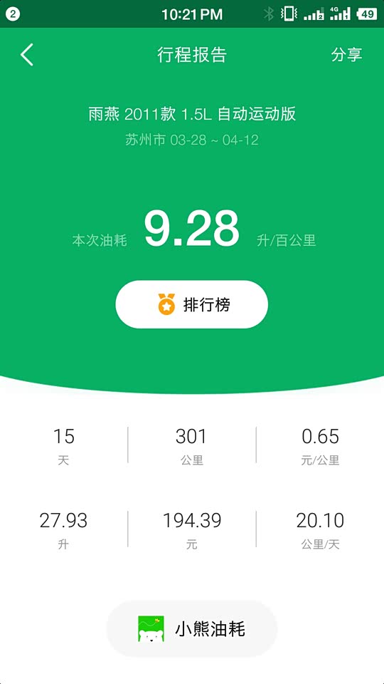 3.11拿到车,并没有开始记录油耗,3.28第一次加满,开始记录油耗,4.12再次加满,得出第一次油耗,说实话,本来预期是8个左右,没想到竟然超过9了,确实有点意料之外~ 当然也有点情理之中吧,这15天基本上,每天上下班,周末出去兜几圈,其实,我家离公司也就4公里的路程,纯粹是为了多摸摸车,才开的,周末的时候出去了一趟,开了空调,大概60公里左右,晚上回来的时候路上没有人,就踩了几脚油门,如此就导致了这第1次油耗超过9,不知道长期如何~