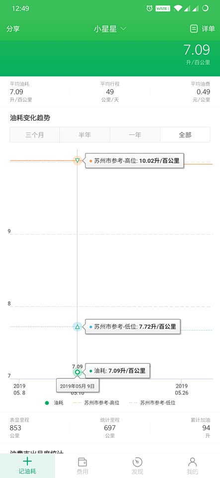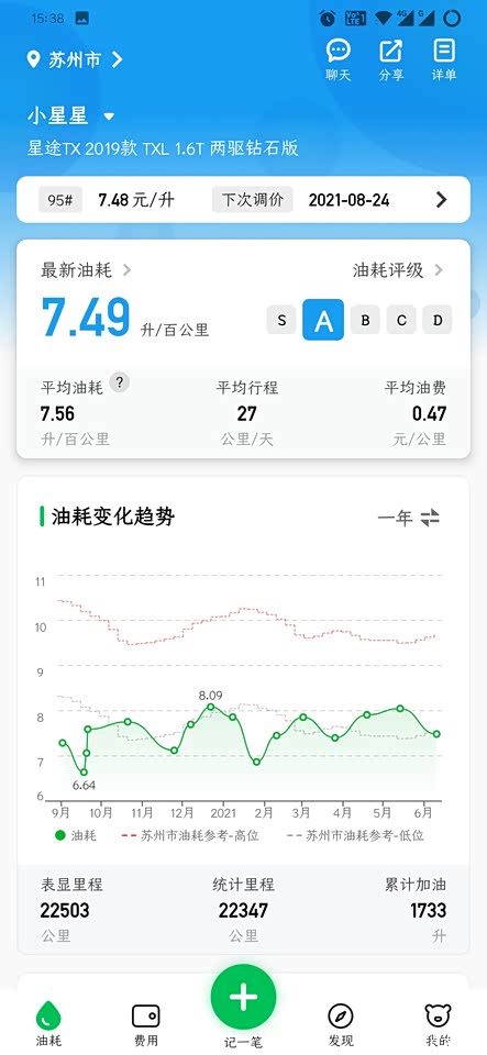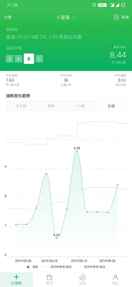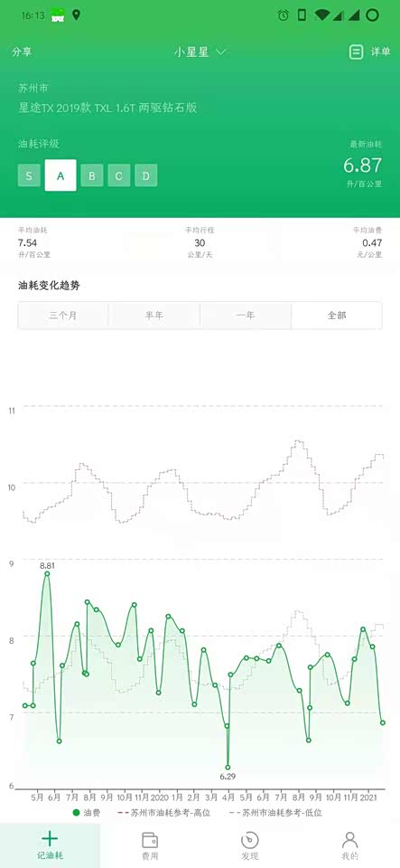 基本为城市道路+高架道路。佛系驾驶,提前预判,避免过多的刹车和急加速,可以做到超级省油。近半年几乎没有上过高速,所以这油耗还是可以接受的。