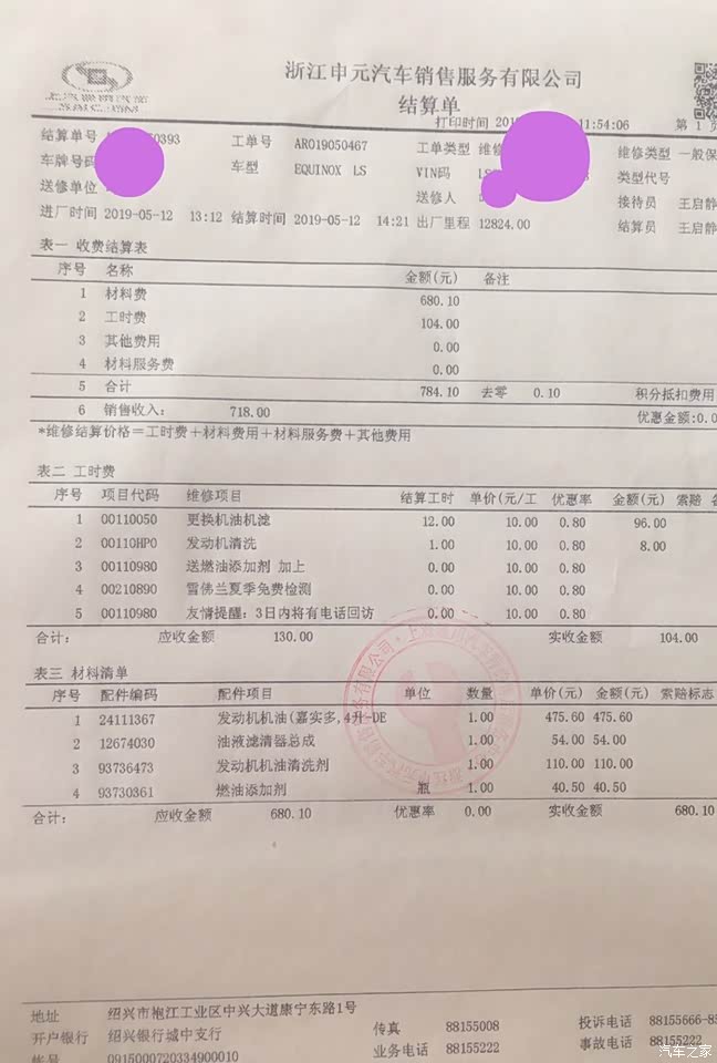 车子目前行驶了13500公里,严格按照4S店的保养里程来的。首保3500公里做的,更换了发动机的机油和机滤,没有花钱。第二次6797公里保养的,也是更换发动机机油机滤。第三次是12824公里保养,这次保养多了一个清洗发动机的项目,我去车间看了一下,用的嘉实多机油,一壶4升。因为我是预约保养的,4S店送了一瓶燃油添加剂。最后实际付费700多元。