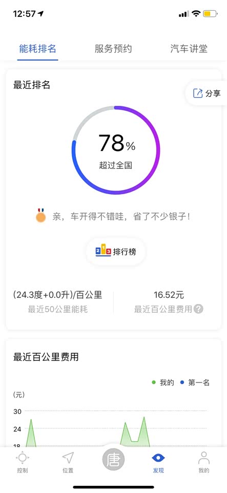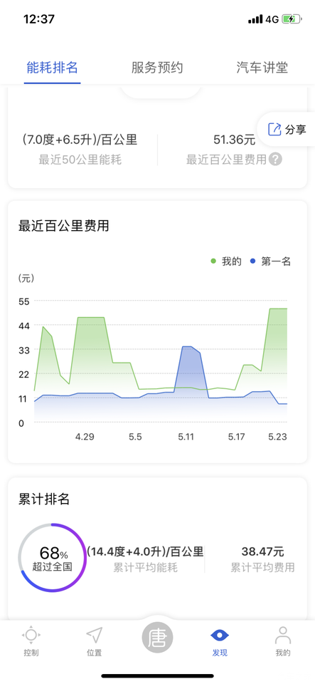 目前的能耗排名不高了,因为高速开的比较多,加油量比较多,纯电行驶比较少的原因。
