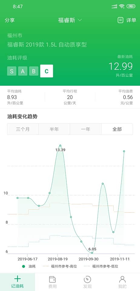 福睿斯城市油耗偏高,特别是开了空调以后,油耗高到吓人,看着油表指针往下掉。高速路段油耗还是可以接受的。最近天气凉快了,在市区内开车也没有开空调了,感觉油耗低了一点点,没有开空调时那么耗油了,油表指针下降的明显慢了。