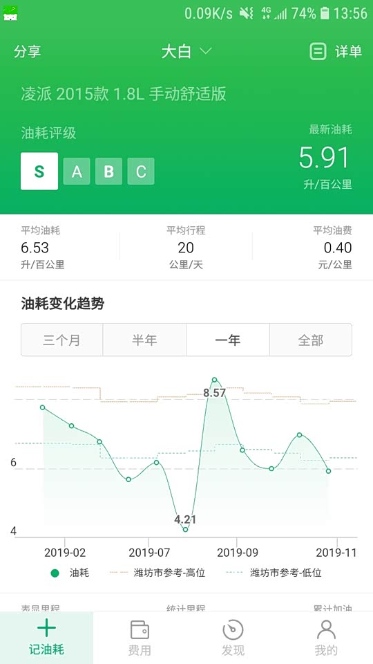 这是前一箱油也就是最近油耗水平,5.91,表显也是5.9,这一段时间车开得比较稳,油耗控制的比较好