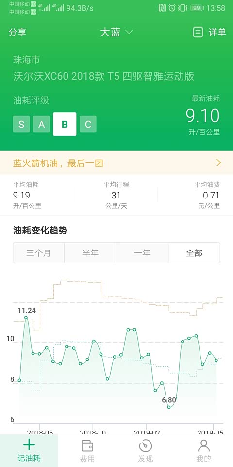 从买车第一天开始就一直在汽车之家和小熊油耗上记录每一次的加油和里程数据,一次都没有落下。现在15000公里左右,综合油耗9.19L/100KM(两个记录途径的结果是一致的,绝对真实的油耗,精确到小数点后两位)。对于2.0T,自重1.8吨多的SUV来说,我觉得很满意了。
