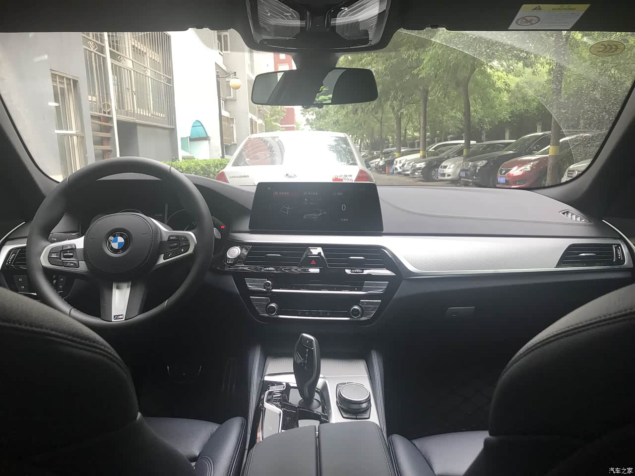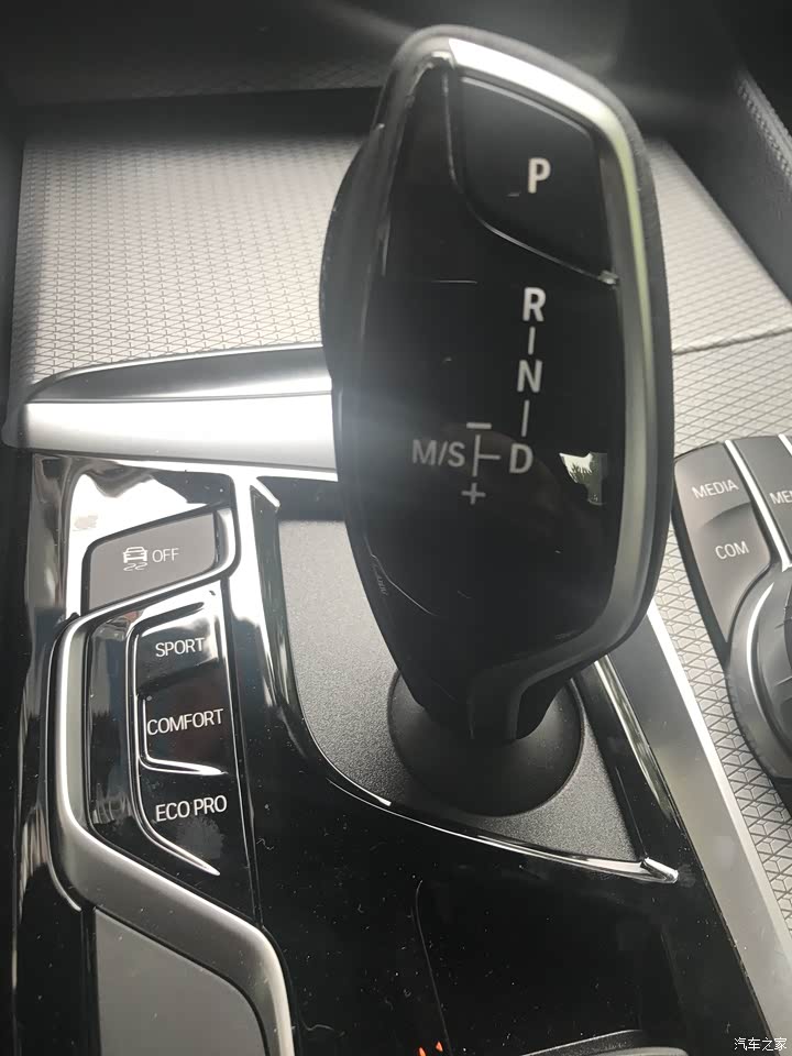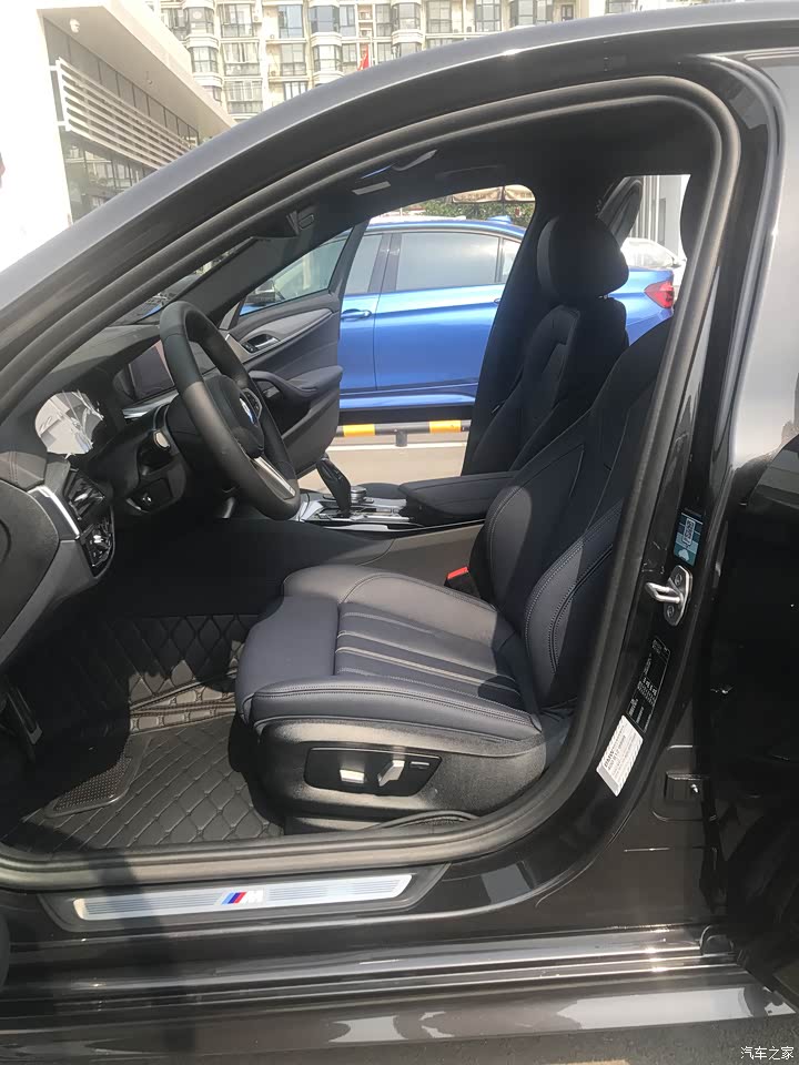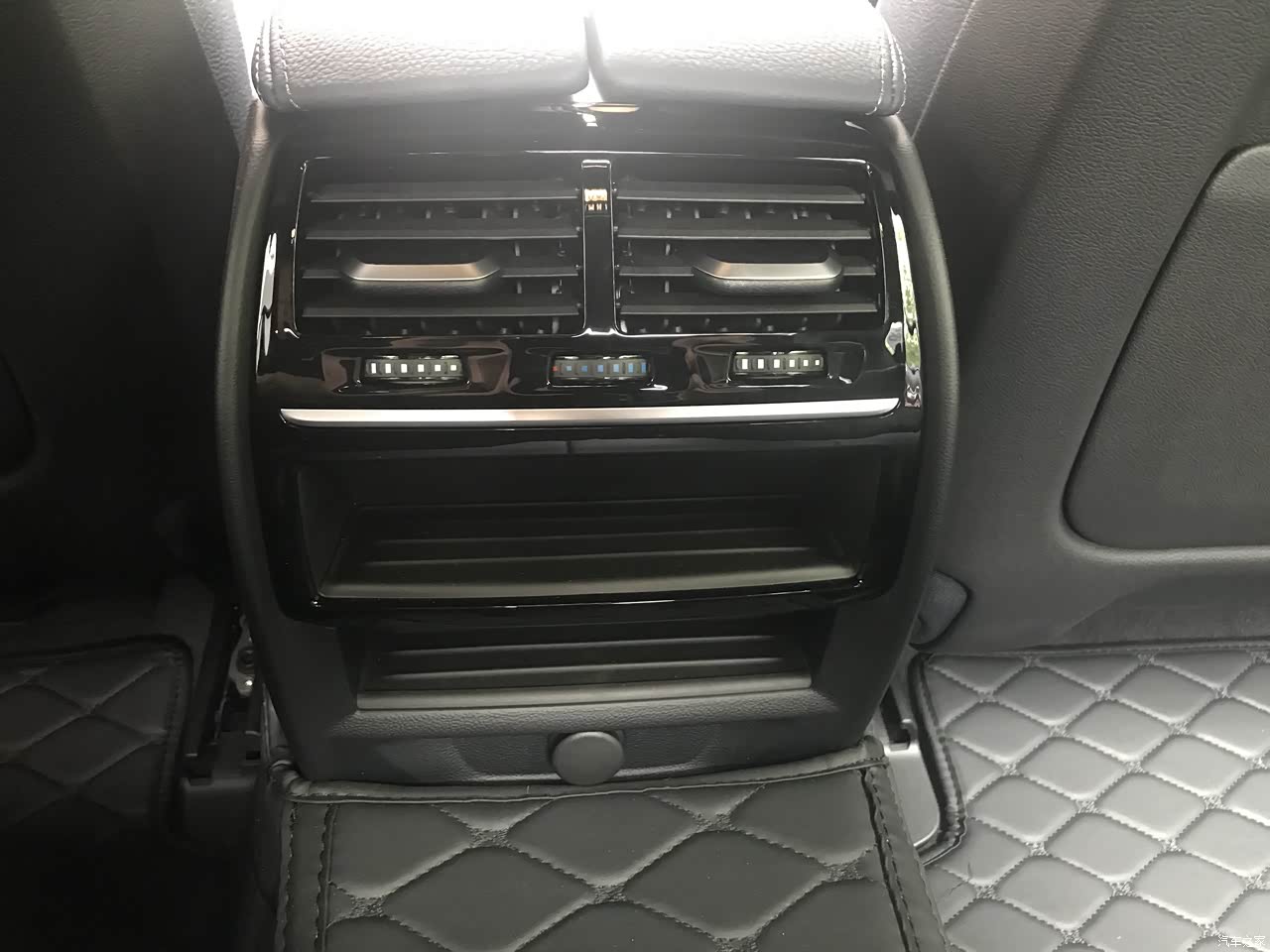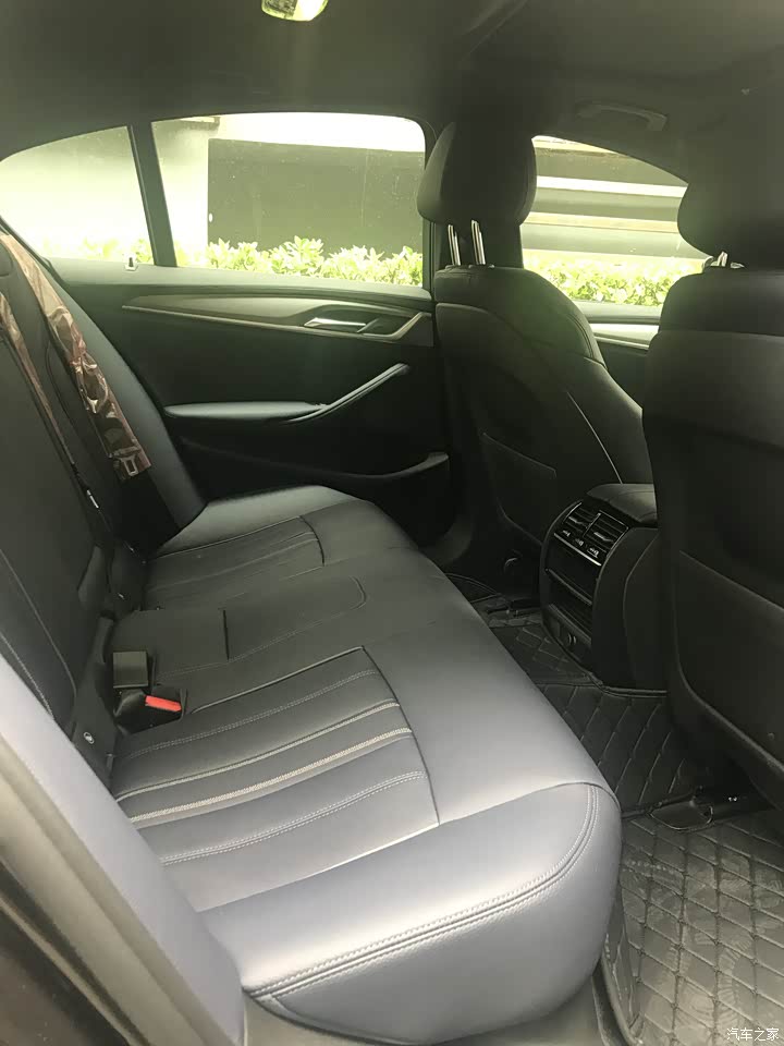 内饰最满意的部分也是这个暗夜蓝,和外观的神秘灰类似,也是在光线好的时候呈现灰蓝色,光线暗的时候显出黑色。内饰常看到和能摸到的地方都覆盖了真皮,菱形纹铝内饰板比530i和540i上的木饰板更能体现运动风,就是太阳一晒之后会非常烫,夏天需要当心不要让皮肤接触内饰板。整个内饰比较low的就是后排的空调出风口和后座的扶手了,基本和十几二十万的车没啥区别。