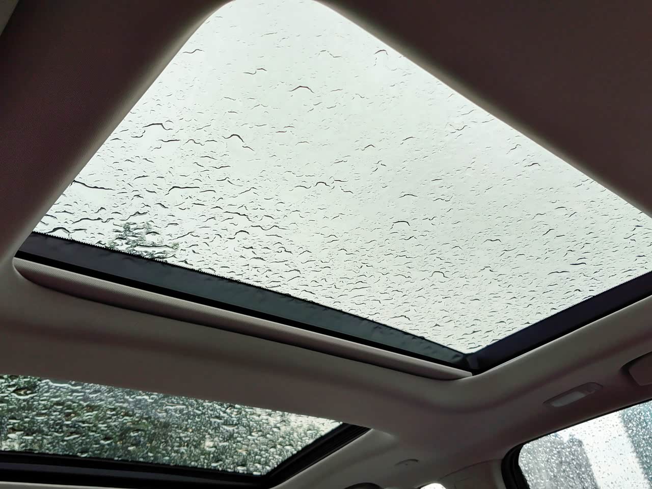 全景天窗是个彩蛋,后排乘客的目光与车顶上的阳光与绿叶互动,大大减少乘坐时的压迫感。这种空间交互的体验
