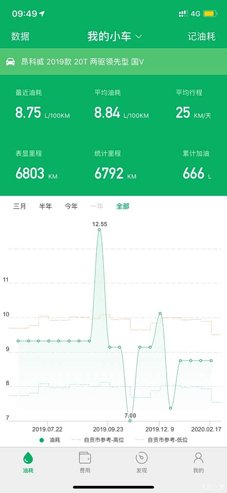 油耗目前总里程显示已经到了9.8!我从4儿子店开回家路上看了油耗还不错!到手时表显7公里,回家路上拍了下油耗!后面基本都在9左右,希望过了磨合期能到8以下就好了!开过几十公里高速,油耗6.8!市区基本就是9点几,等过了说明书上的805公里磨合期。