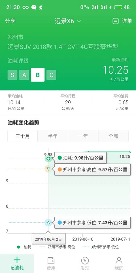 为什么给这么低该大家讲讲,我目前行驶1600+欢乐表就不提了太欢乐,我用小熊油耗算的基本上一直维持在9.8-10.25,期间自己也注意了公里和油耗也确定是10升百公里,有人说首保后就会低我也相信真的会低,但是作为一个重1.5吨用的是1.4T还是匹配CVT的车子这油耗接受不了,(如果开车比较激进就不会这样,买完车子磨合期没敢开快过基本上都是维持在1500转,期间跑过两次高速一次15公里,一次300公里才跑2300转100-120迈,其他的都是低速50-60而且没有堵过车没有进过市区都是在环线或高架快速通道跑)这样的油耗谁受得了,我家有一辆路虎揽胜极光2.0T油耗12升,发现四4.0汽油版16升,帕萨特1.8T7升以前的Q52.0T四驱9升,吉利1.4T你给我来个10升。。。说综合油耗7升左右全是骗人的。。。我不期望1.4T像大众那样的动力,最起码油耗像吧接近也可以大众高尔夫速腾7升多你8升多也好呀,10升太不近人情了失望,看了二手的我哥店里有CRV2.4四驱的和途观L330TSI想只是代步买个国产的省油的也是因为中国梦做贡献就买国产的,看了小车老婆和我还有宝宝感觉太小不行就看紧凑型预算也就定在10W,最后选来选去确定了远景X6。