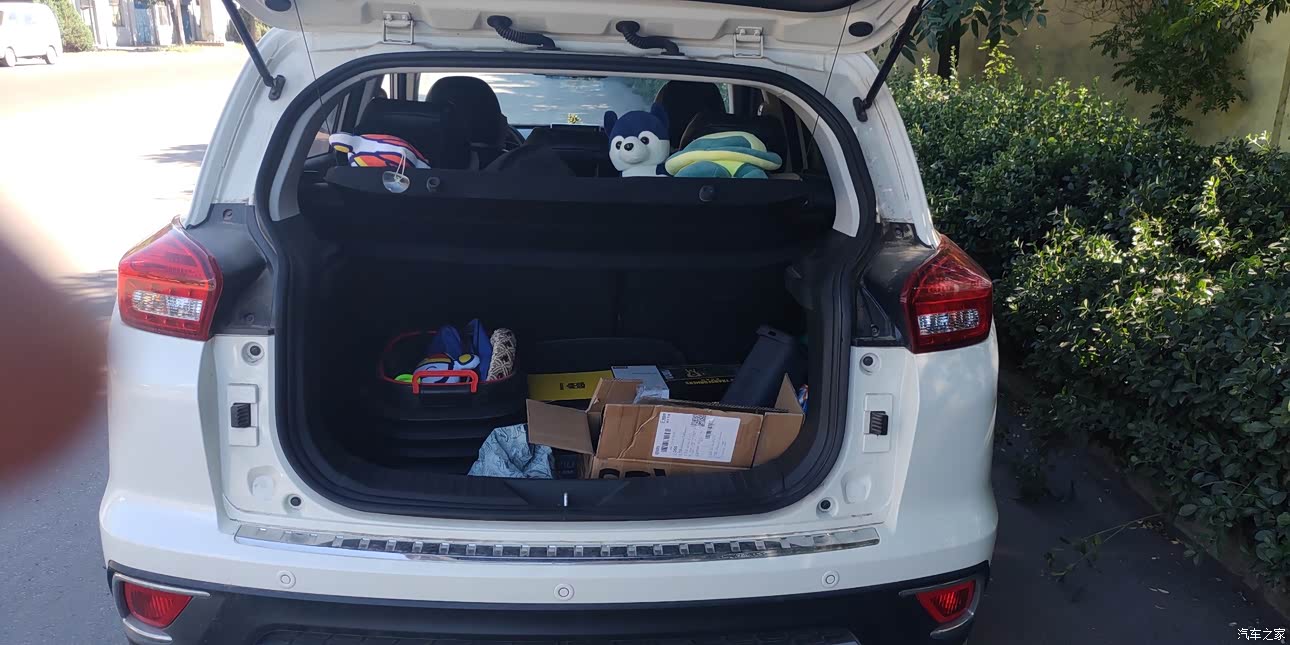 后备箱后面是和别的 SUV 不一样的,都是嵌入式的,像我朋友的 2CS75 的后备箱是平整的,而且我这个后备箱是嵌入式的,所以说空间方面还是我个人感觉都不都差不多都能够在,攒一些东西吧,特别是过年的时候走亲戚的时候,还是放很多东西