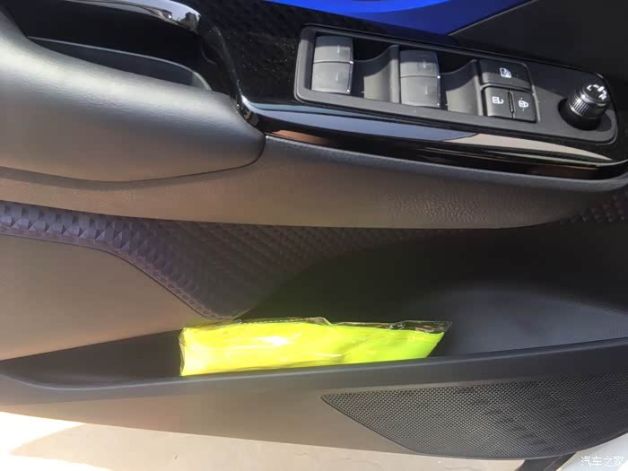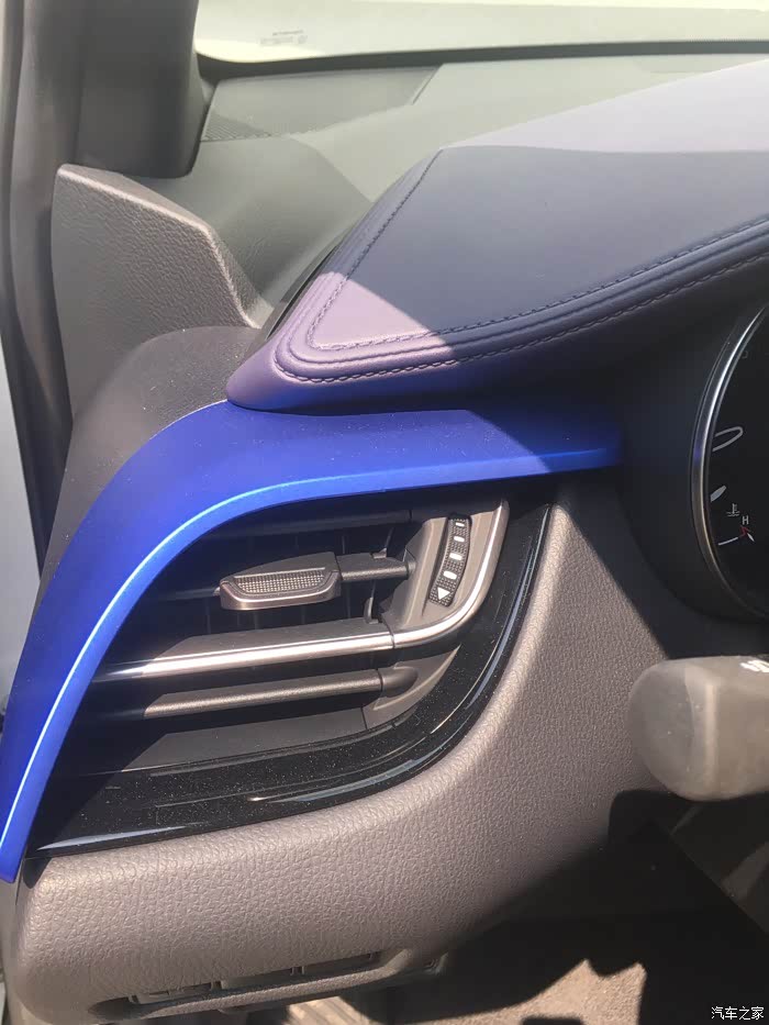内饰也好看呀,到处都是蓝色跟黑色的搭配。特别适合年轻人。整个车里都穿插这种蓝色的饰条,很潮