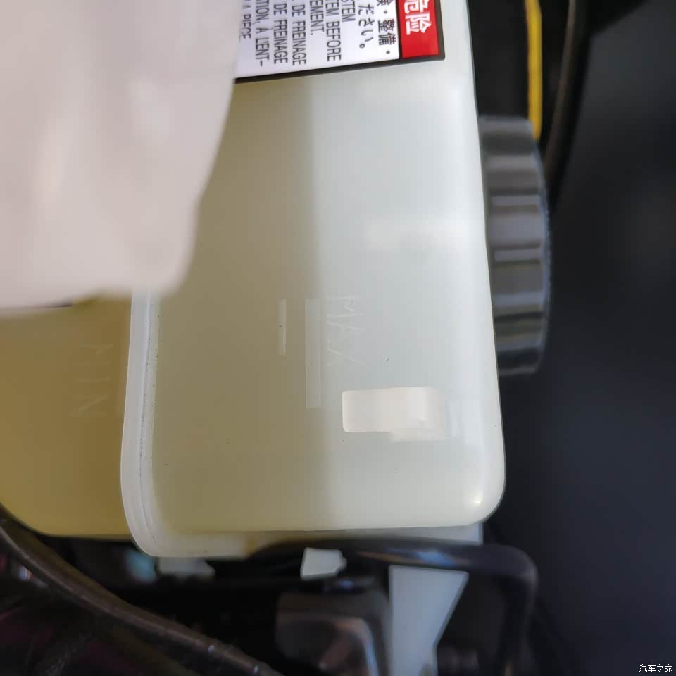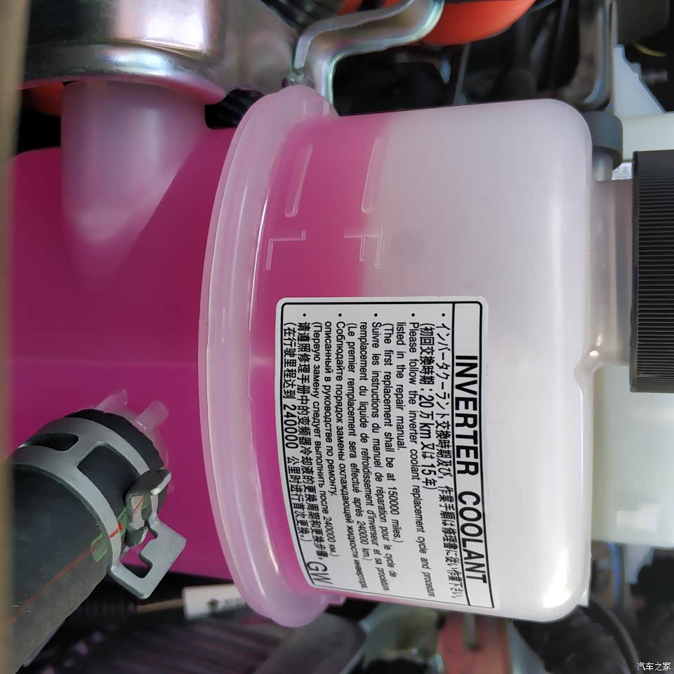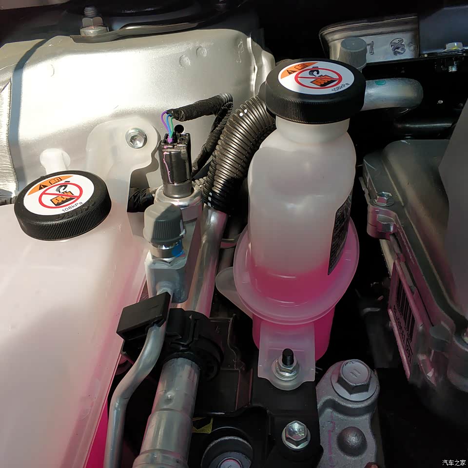 闪光点在于冬季暖风供应机制增加了电加热,不需要发动机运转就可以出暖风,这是电加热器的冷却液瓶子。