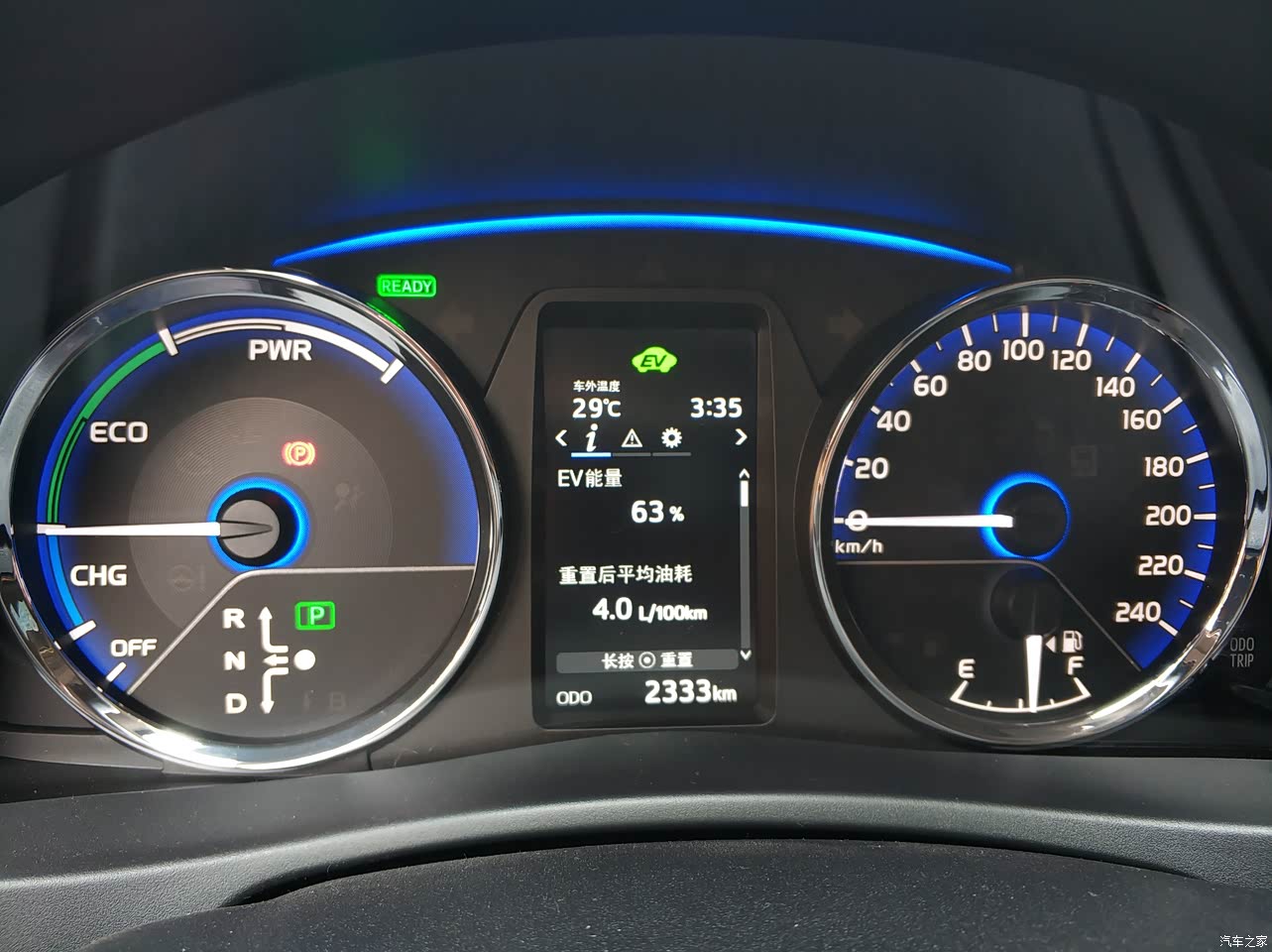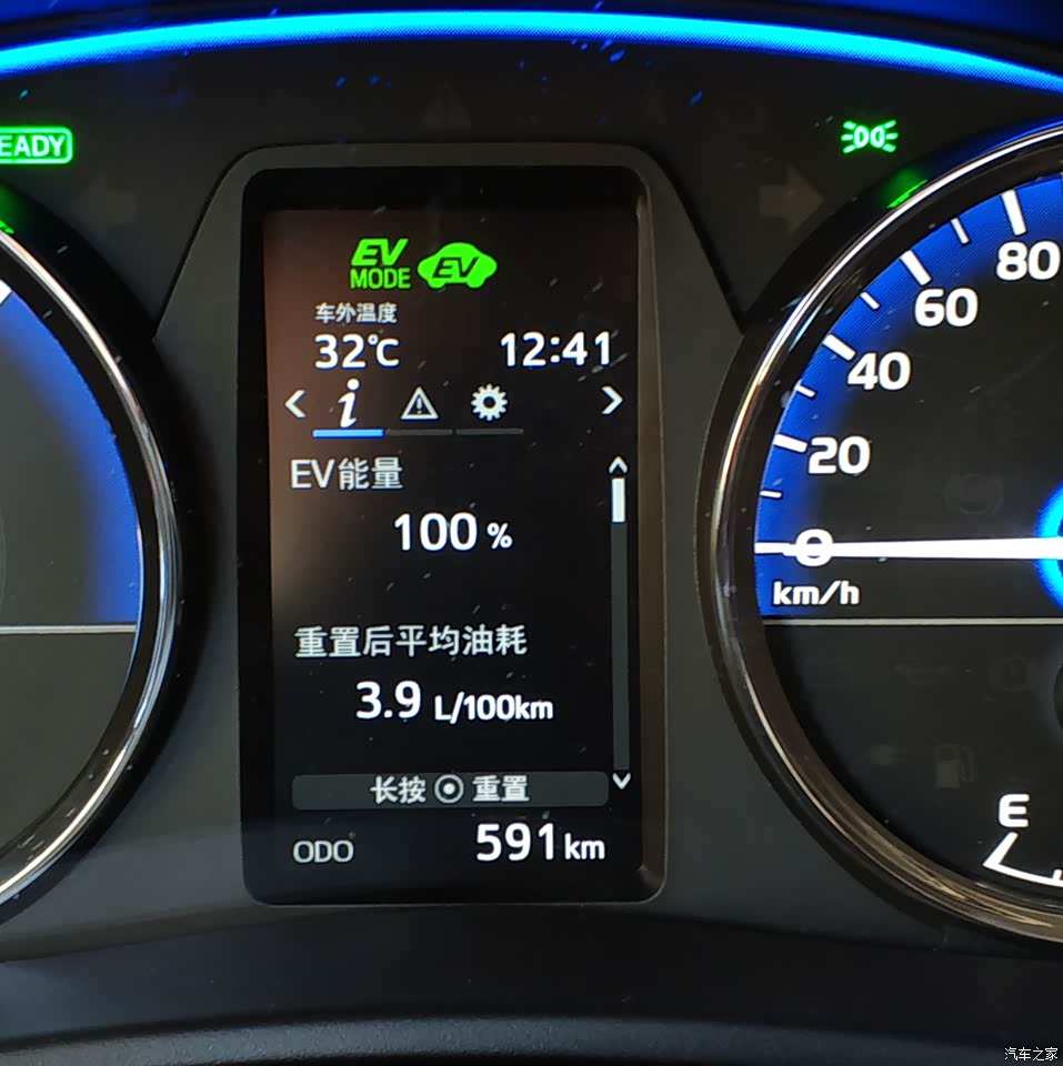 目前充满电之后系统显示的纯电续航里程为54.9公里,电池性能与提新车时无变化,纯电行驶的单位里程能耗为16KWH/百公里,可能经常行驶于闹市区拥堵路段的原因较发表上一次口碑时的14.6KWH/百公里能耗略有升高。实际综合路况测试,车辆工作在加满油充满电而又不使用纯电模式的情况下节能效果最好,HV普通模式的驾驶感受又强于ECO模式。到目前为止能耗计量从没有重置过,也就是说屏幕上显示的平均油耗就是提车之后的总平均,可见节能效果之显著并非传说。