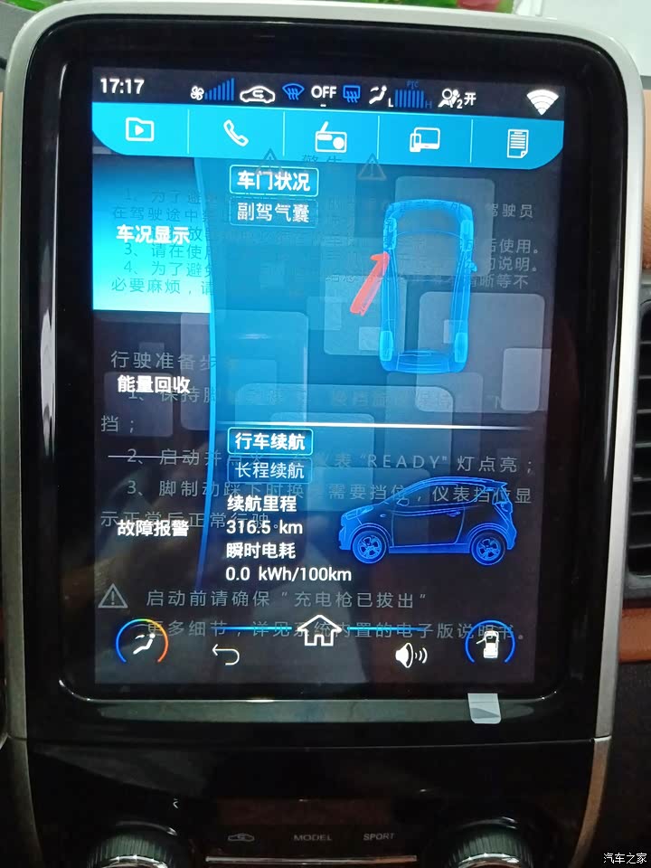 这款车给我最大的感受是, 1.静音效果好,没有发动机噪音, 2.乘坐舒适度好,显得空间大, 3.空调效果感觉还行。在制暖制热的情况下比油车强多了,操作又方便。 4.双色内饰,显得上档次时尚美观,在同级别前排座位是最长最宽的。坐上去以我个人感觉很舒适,对于这空间来说还是比较满意的。