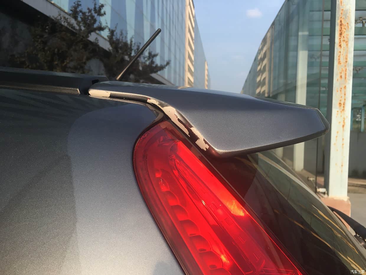 车辆款式在当年还算不错的,现在看来虽不过时但还是沉闷了一点。毕竟是八年多的老车,多处车身车漆都有磨损,有几处划痕,前保险杠与翼子板接缝不均,估计里面卡扣有损。后窗有安装尾翼不知道是不是原厂件,尾翼车漆有明显大片脱落。