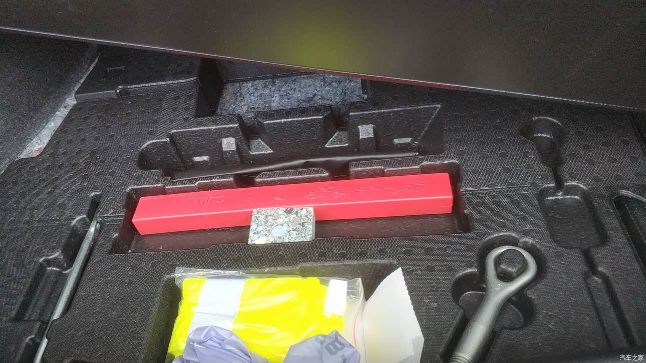 这车没有备胎,后备箱解锁开启后还得手动顶起来,但是有个液压支撑