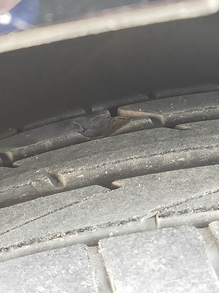 轮胎不知怎么回事掉了一块肉,不知道是不是轮胎质量问题,目测应该问题不大。
