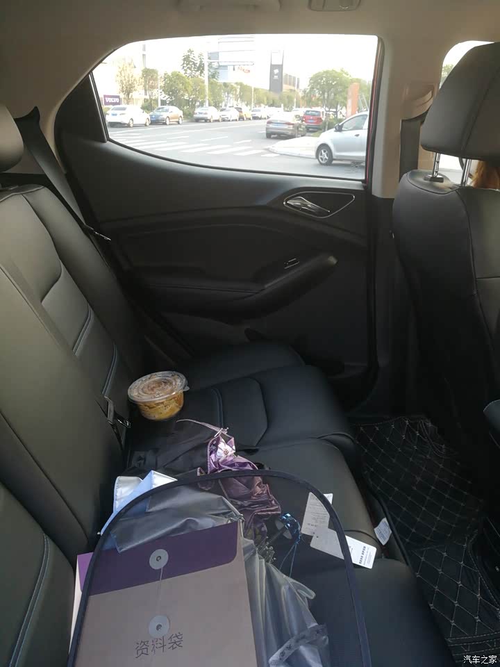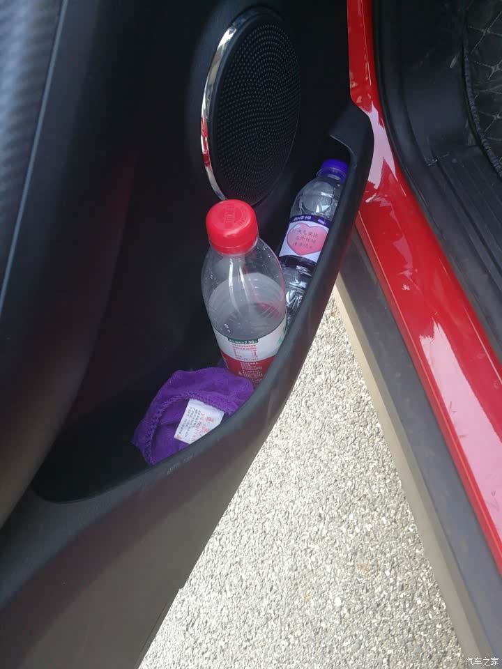 车子虽小,放东西的地方还挺多。门边可以轻松放下两瓶矿泉水。前排空间足够,后排座位坐三个胖子有点挤。
