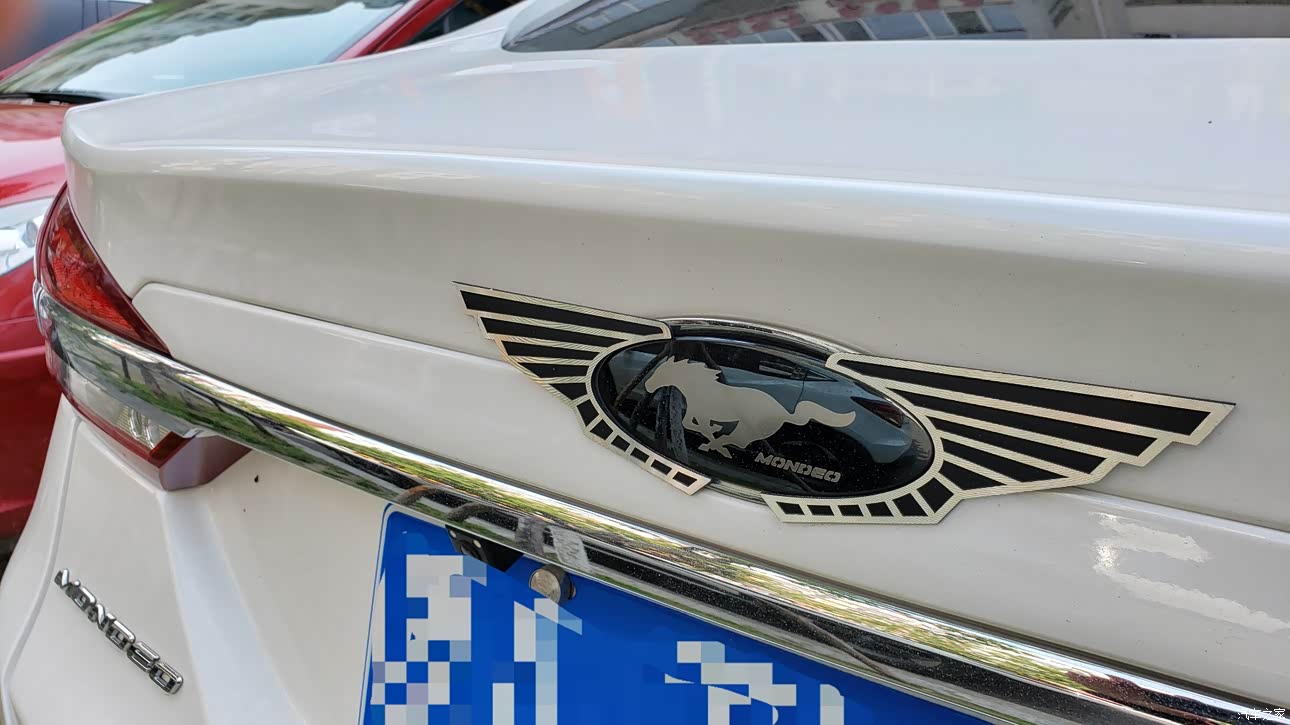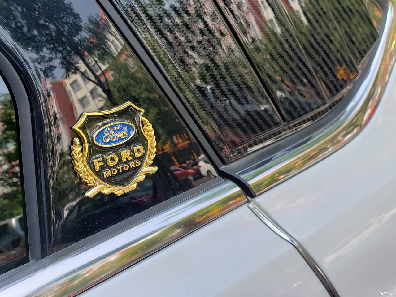 c柱三角窗旁边贴了一个福特的盾徽,三角窗贴上了类似于碳纤维材质的配件