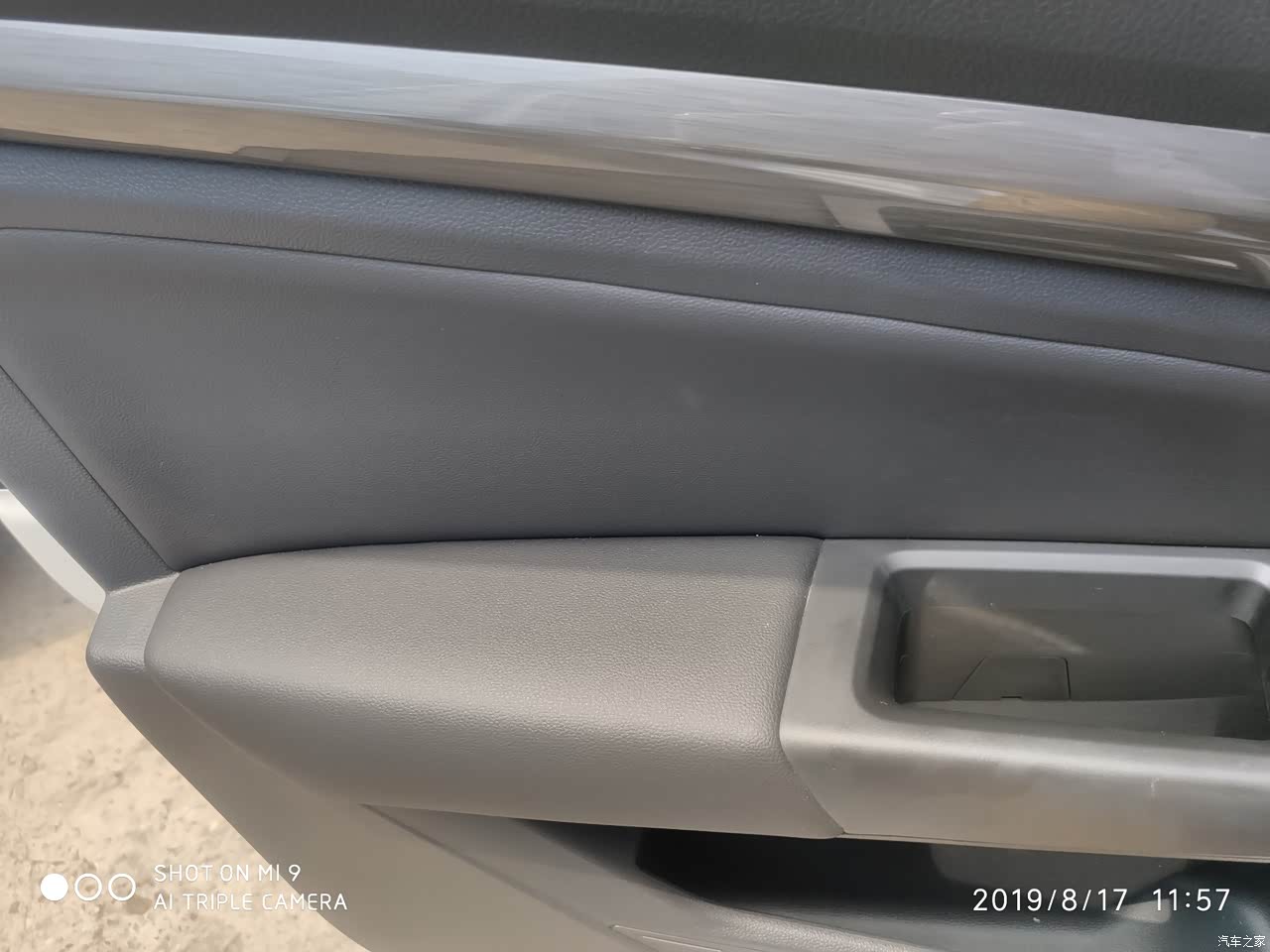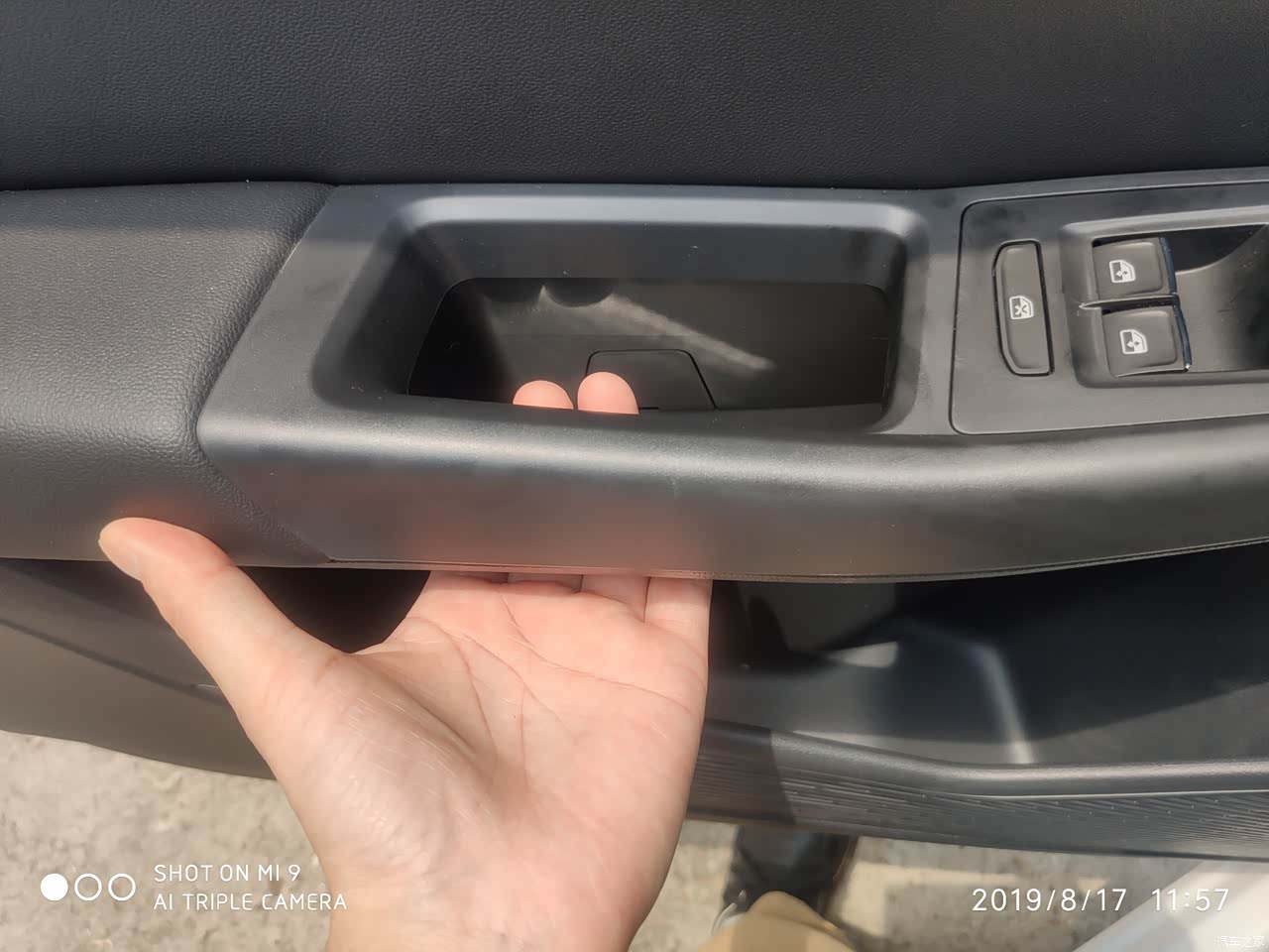 内把手是镂空的,有皮革包裹,手感不错。不过总感觉那里空荡荡的,打算买几个盒子放一下。 皮革容易吸热,虽然大夏天被太阳一晒烫得要死,但并不是车的问题。这一点,再贵的豪车也逃不了。