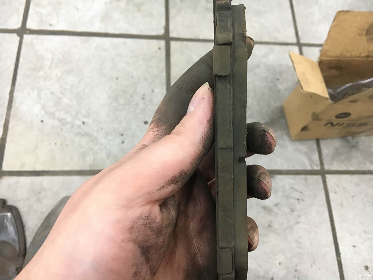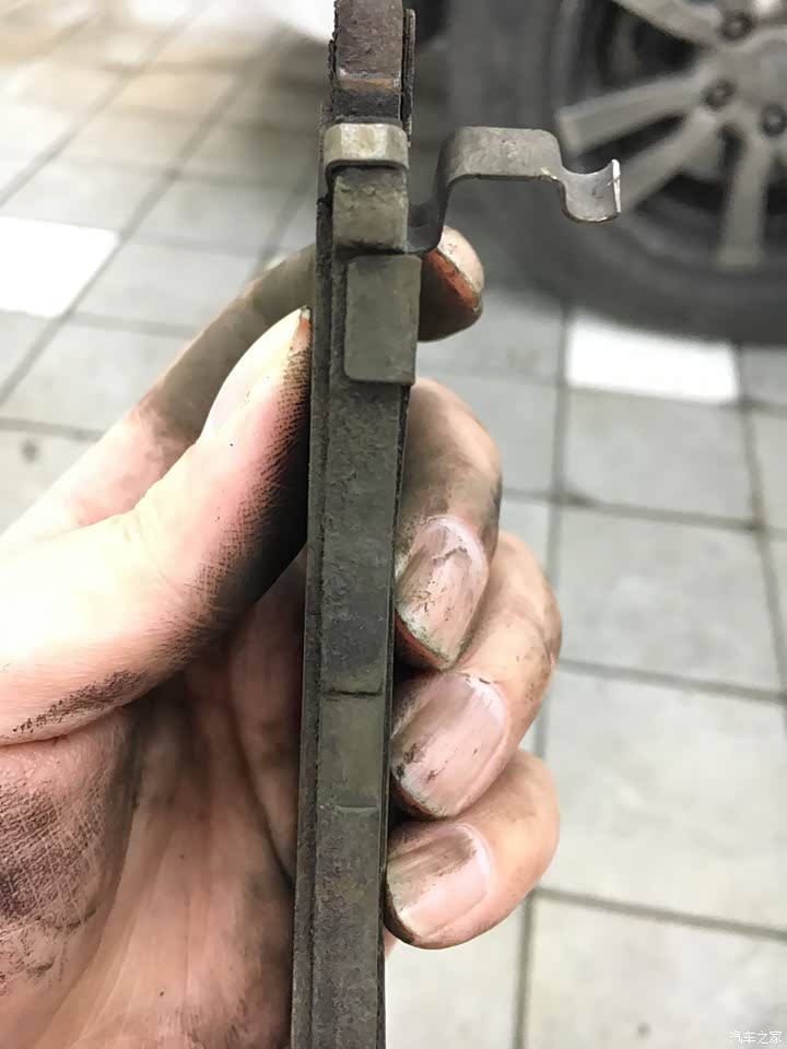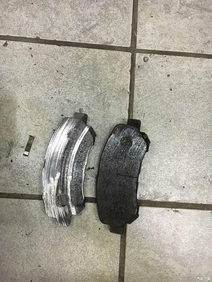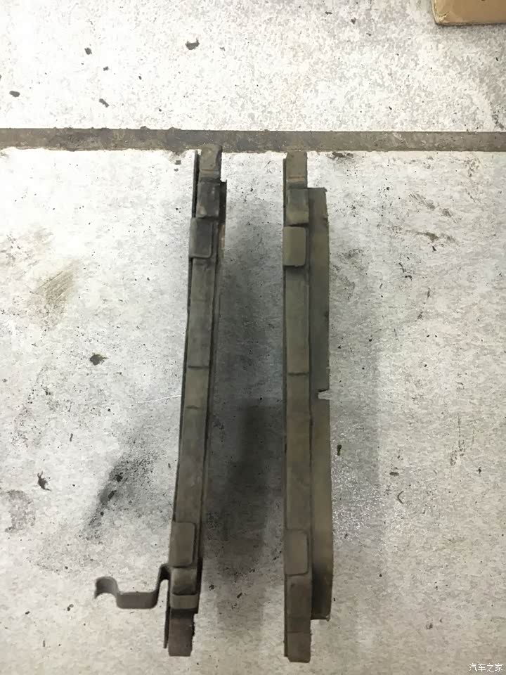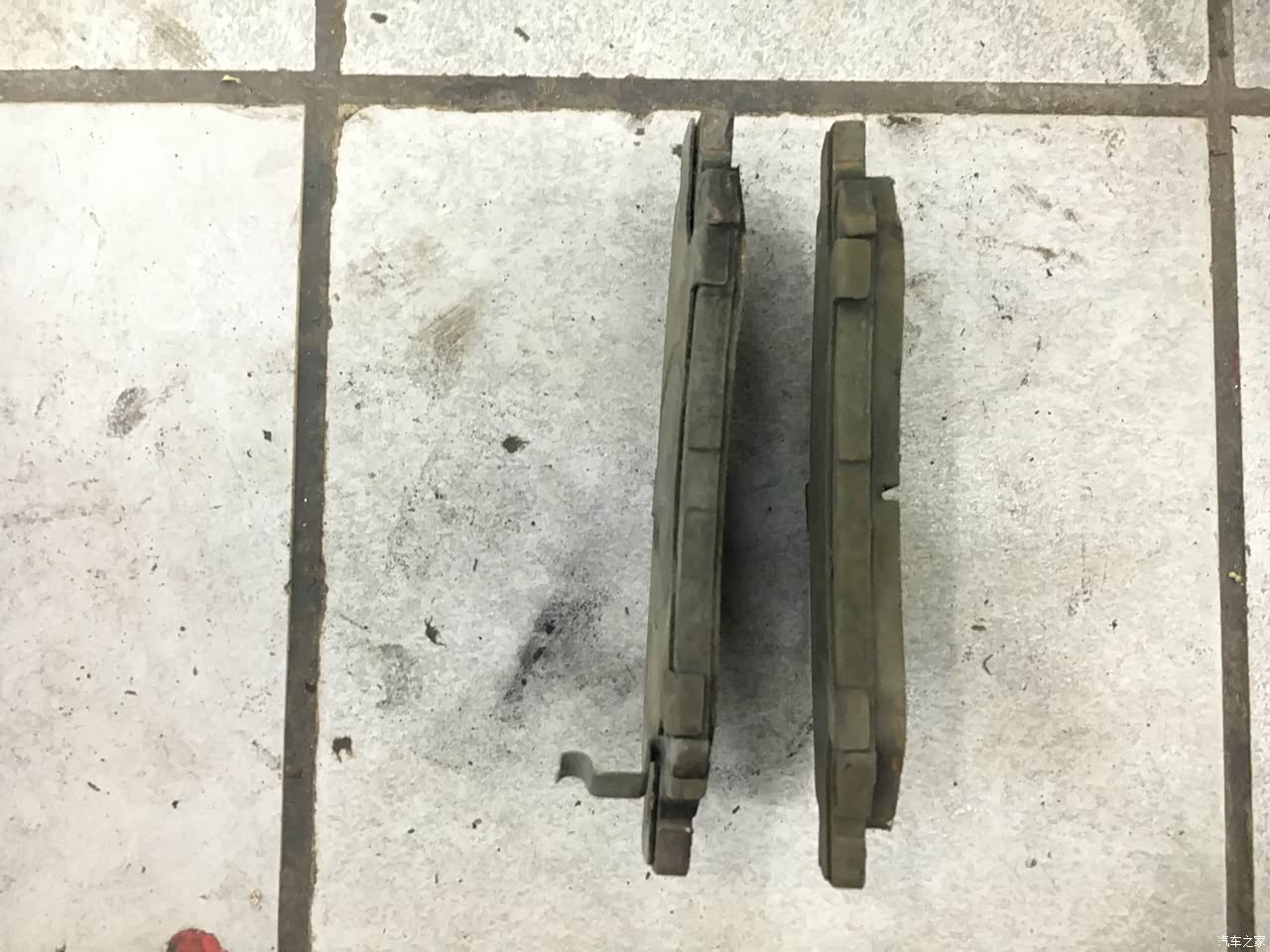 左前刹车片被磨光,直接导致刹车盘被磨花,其实这都不是事儿,奇葩的是右前刹车片还剩很多,下图3是我拍的左前和右前刹车片的对比图,可以很明显看到左前和右前刹车片的厚度相差很远,不是很远,是很遥远,我还能说什么呢,刹车系统存在问题,存在偏磨吃左前刹,启辰啊启辰啊,能否让我安心启程啊。