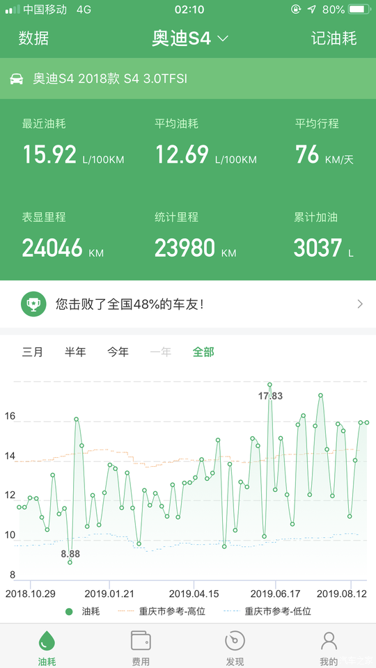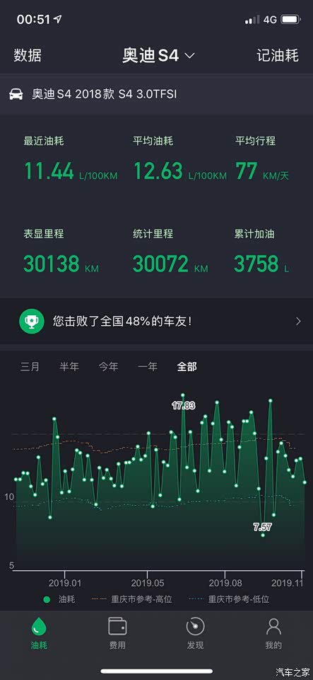 油耗比较稳定了,综合12.63,冬天了不开空调11.5-12左右